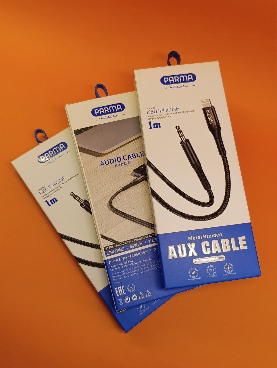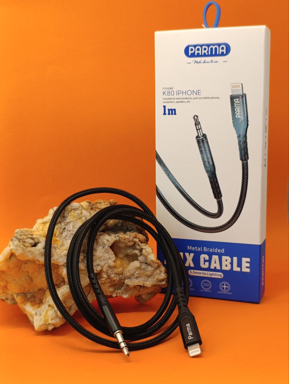 آیوایکس | AUX با برند پارما | Parma که یکی از با کیفیت ترین محصولات حال حاظر بازار است با جنس برزنتی نرم و مناسب برای تلفن همراه های iPhone | آیفون که دارای جک صدای لایتنینگ هستند می باشد.